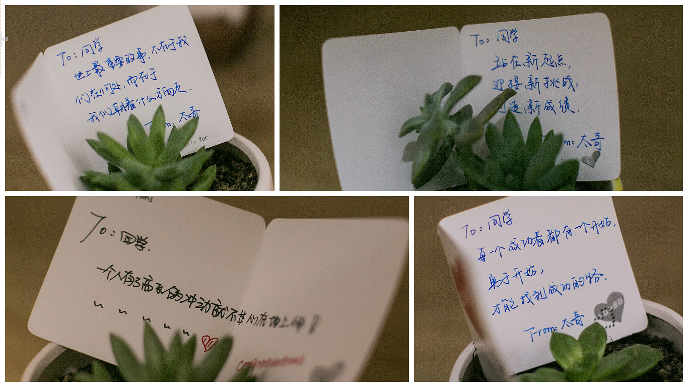 細(xì)心的同學(xué)們可能看到還沒有搬進(jìn)學(xué)員的空宿舍里桌子上都擺著一盆小多肉,這其實(shí)是我們隨“床”贈(zèng)送的小禮物,走近看更是有手寫卡片放在上面,滿滿的期望和愛意,太奇人小到細(xì)節(jié)的關(guān)心著學(xué)員的學(xué)習(xí)和生活。