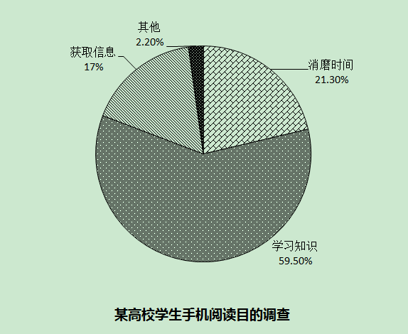 It can be seen from the pie chart that reading with mobile-phone for learning in this university occupies 59.50%. On the contrary, reading with mobile-phone for entertainment and searching for the information take up 21.30% and 17% respectively. The pie-chart reveals a phenomenon that reading with mobile-phone has a far-reaching influence on the university students and reading pattern.