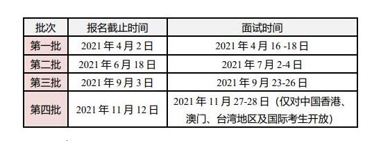 資料齊全且通過審核后,學(xué)院將以電子郵件的方式給予反饋,在各批次報名截止時間后按照相應(yīng)批次的面試時間統(tǒng)一安排面試。考生須攜帶考試通知上所要求的材料參加面試。面試時須攜帶所有資料原件進行資格審查。通過面試者將獲得條件錄取資格。