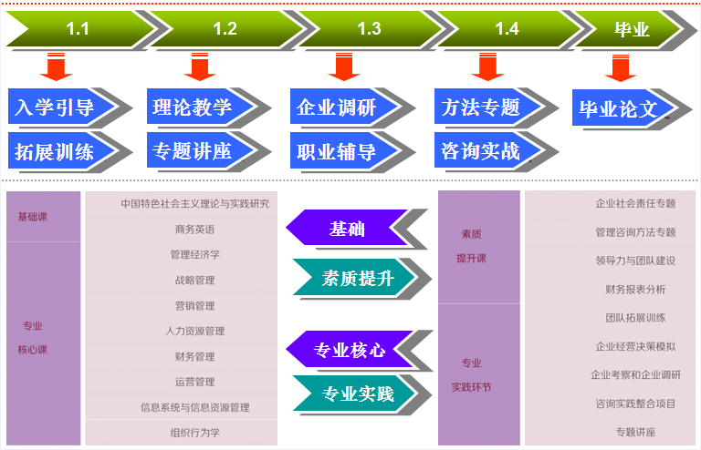 北方工業(yè)大學(xué)工商管理碩士(MBA)致力于培養(yǎng)注重方法與技能的應(yīng)用型中高層管理人才。在培養(yǎng)過程中實(shí)行“通才教育 + 專長發(fā)展”的培養(yǎng)思路。切實(shí)幫助學(xué)員在兩年的MBA學(xué)習(xí)中實(shí)現(xiàn):思維范式轉(zhuǎn)換、知識(shí)體系更新、方法技能嫻熟、管理能力提升四個(gè)轉(zhuǎn)變,最終提升綜合管理勝任素質(zhì)。